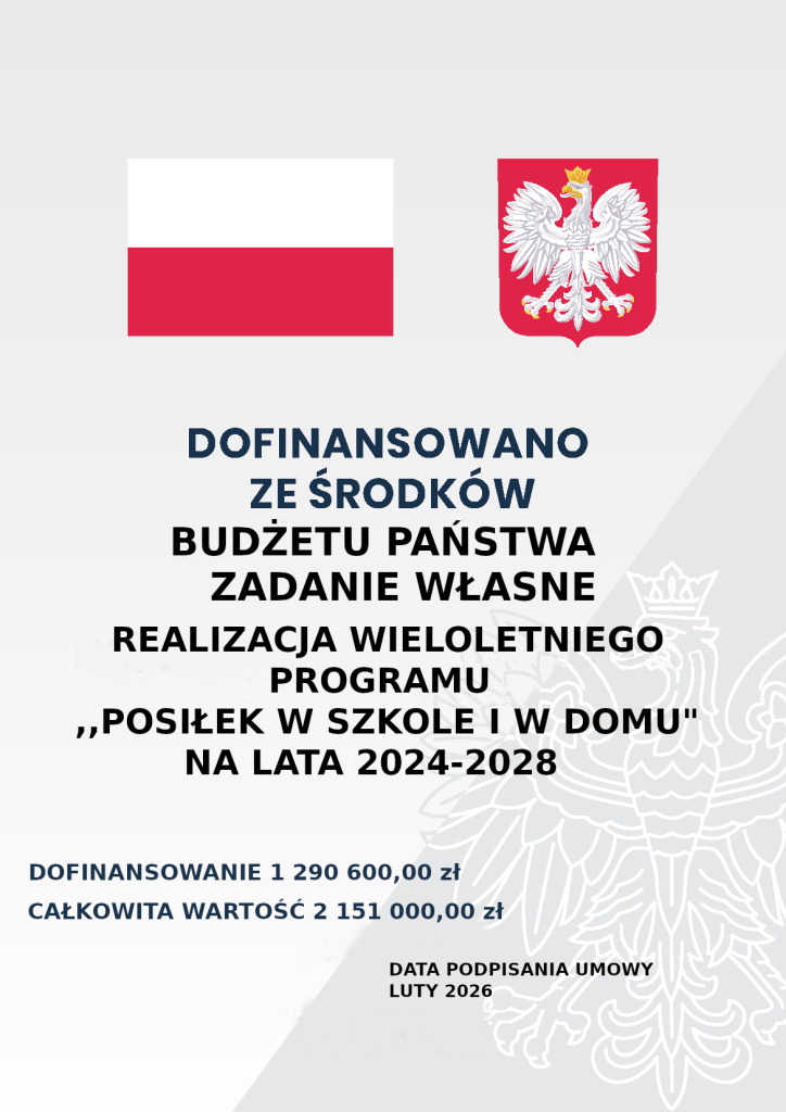 Realizacja Wieloletniego Programu ,,Posiłek w szkole szkole i w domu” na lata 2024-2028. Dofinansowanie 1 290 600,00 zł, całkowita wartość 2 151 000,00 zł. Data podpisania umowy luty 2026.