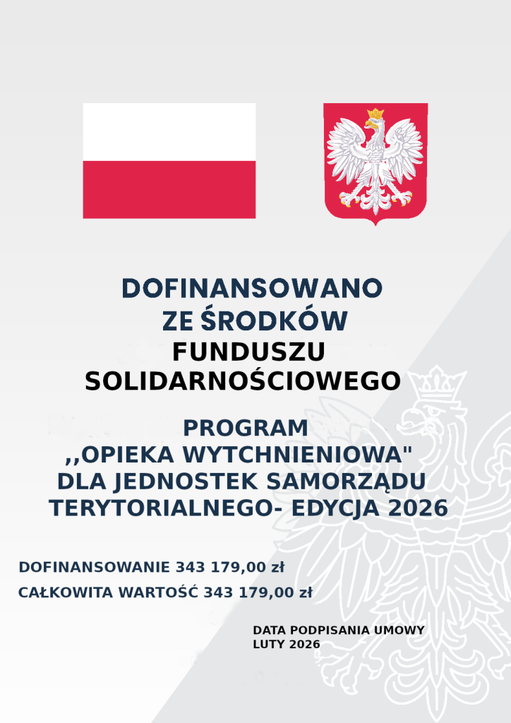 Dofinansowano ze środków Funduszu Solidarnościowego. Program „Opieka wytchnieniowa” dla Jednostek Samorządu Terytorialnego- edycja 2026. Dofinansowanie 343 179,00 zł, całkowita wartość 343 179,00 zł. Data podpisania umowy luty 2026.